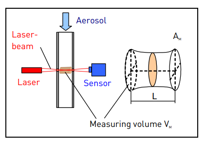 高濃度氣溶膠顆粒流過光束交叉的測量單元,導(dǎo)致消光。通過測量平均透射率及其波動,可以獨(dú)立于待分析的氣溶膠材料的折射率來計算顆粒數(shù)濃度。如果折射率已知,則可以同時計算平均粒徑。