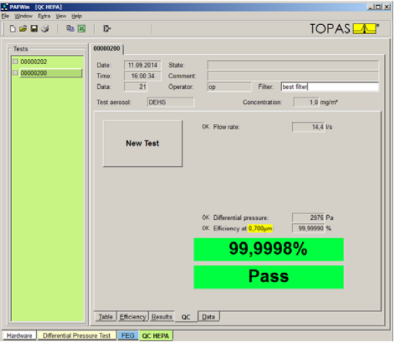 所有使用的氣溶膠儀器的控制,包括數(shù)據(jù)采集,都由最先進(jìn)的AFCWin軟件支持。它可靠地引導(dǎo)操作員完成整個(gè)測試程序,并最終生成測試報(bào)告。所有測試都存儲在數(shù)據(jù)庫中,這使得在過濾器生產(chǎn)過程中可追溯質(zhì)量保證。