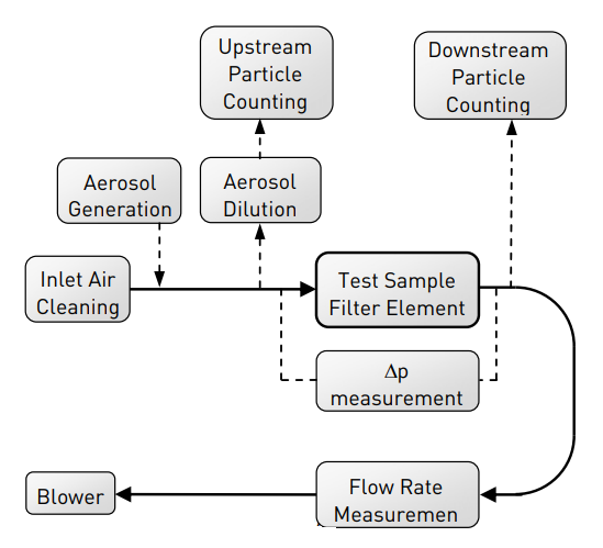 該空氣過濾器測試系統(tǒng)旨在滿足EN1822-4附錄E“0.3微米至0.5微米粒徑顆粒的效率泄漏測試”的要求。該標(biāo)準(zhǔn)的這一部分與由于其幾何設(shè)計(jì)而無法掃描的過濾元件有關(guān),在這種情況下,確定整體過濾效率對于質(zhì)量控制來說是足夠的。與替代的油霧測試程序相比,這種方法對有缺陷的過濾器件提供了更可靠且更快速的結(jié)果。此外,在測試過程中因測試受到的氣溶膠負(fù)載要少得多。所需的測試氣溶膠是由特殊的氣溶膠發(fā)生器(ATM 221)使用標(biāo)準(zhǔn)的DEHS測試液產(chǎn)生的。為了上游濃度測量,使用第二個(gè)光學(xué)粒子計(jì)數(shù)器和串聯(lián)的自調(diào)節(jié)稀釋系統(tǒng)(DIL 540/C)。另外一臺光學(xué)粒子計(jì)數(shù)器測定下游顆粒數(shù)濃度。得到的整體過濾器效率與名義過濾器效率進(jìn)行比較,給每個(gè)測試的過濾器一個(gè)最終的“通過”或“失敗”結(jié)果。