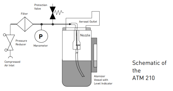 ATM210核心部件是由不銹鋼制成的新型霧化噴嘴?;趪娚湓淼?/span>雙流道噴嘴,與放置在噴嘴出口附近的擋板相結(jié)合。這種集成式顆粒撞擊擋板可去除大的噴霧液滴,產(chǎn)生的顆粒物尺寸主要為1um。壓縮空氣必須由HEPA過濾器凈化。減壓閥和壓力表有助于調(diào)節(jié)霧化發(fā)生器壓力。霧化器外的液位指示器方便用戶在操作期間檢查液位。