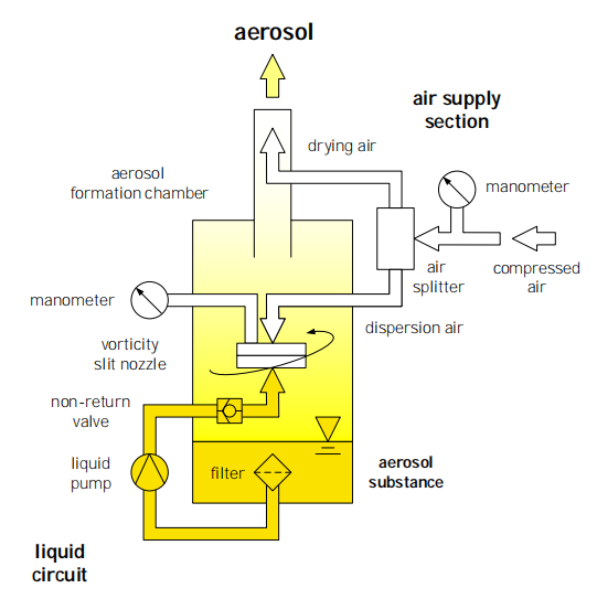 ATM 240/L配備了渦流狹縫噴嘴,該噴嘴供應氣溶膠物質(zhì)(PSL分散體)和壓縮空氣。從噴嘴狹縫處出來的液滴氣溶膠中,粗液滴最初由于慣性而分離。更細的液滴通過特殊的渦流環(huán)分布在氣溶膠腔室中。壓縮空氣將逐漸干燥的氣溶膠帶走。在離開發(fā)生器之前,氣溶膠顆粒會暴露在干燥空氣中,以確保在發(fā)生器出口處形成干燥穩(wěn)定的氣溶膠。