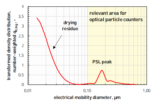 PSL分散體/懸浮液的噴霧和干燥不僅會產(chǎn)生所需的PSL顆粒,還會產(chǎn)生干燥殘留物,這歸因于PSL分散體/懸浮液的穩(wěn)定劑。由于它們的尺寸?。?/span><100 nm),這些殘留物無法用光學粒子計數(shù)器檢測到,因此與過濾器測試無關(guān)。